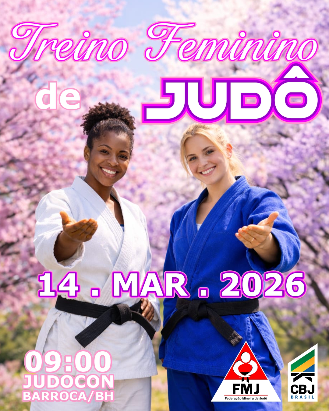 Em celebração ao Dia Internacional da Mulher, a Federação Mineira de Judô e Judocon Barroca convidam todas as judocas para um treinão especial de fortalecimento, união e protagonismo no tatame! Conduzido pelas Sensei Beth e Jeane. Um encontro para celebrar a força, a coragem e a determinação das mulheres no judô! 📅 14/03/2026 ⏰ 9h às 11h 📍 JUDOCON BARROCA – R. Almirante Alexandrino, 627, Gutierrez, BH 👧 A partir de 10 anos Mais do que um treino, um momento de inspiração e crescimento juntas! 💪✨ 👉 Força, coragem e respeito: o tatame também é delas! POR FAVOR CONFIRMAR A PRESENÇA #JudôFeminino #DiaDaMulher #MulheresNoEsporte #Treinão #JudoMineiro #FMJ #Judocon #Barroca #Judô
